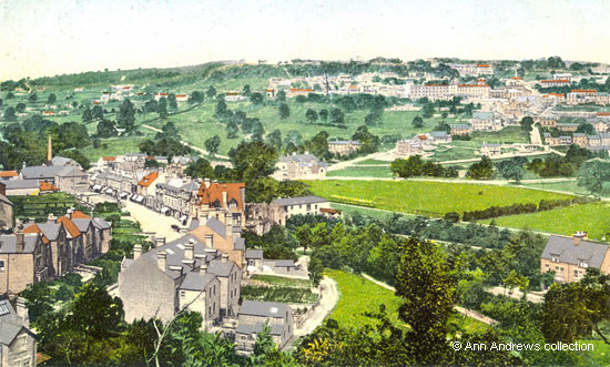 The bridge over the river, originally connecting the Old English Hotel with the Hall Leys, can be seen near the right
