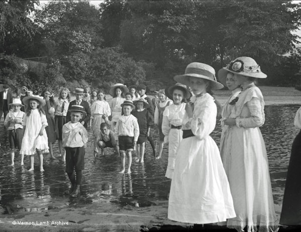 Group of girls and boys, various ages, paddling and wearing their "best" clothes. They could