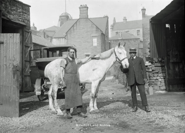 Smedley's Hydro above the buildings. The groom is with a horse, with the reins held by male wearing a boater. The car behind the