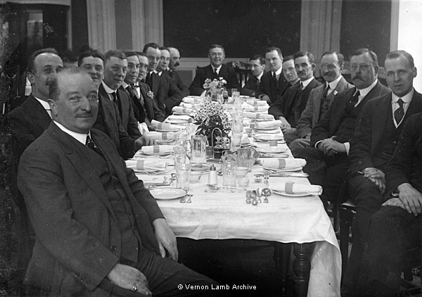 Large group of men seated round table at a dinner