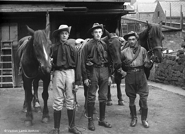 men in riding breeches, with horses. Perhaps they were in fancy