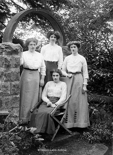 Four girls under stone arch in garden. At least