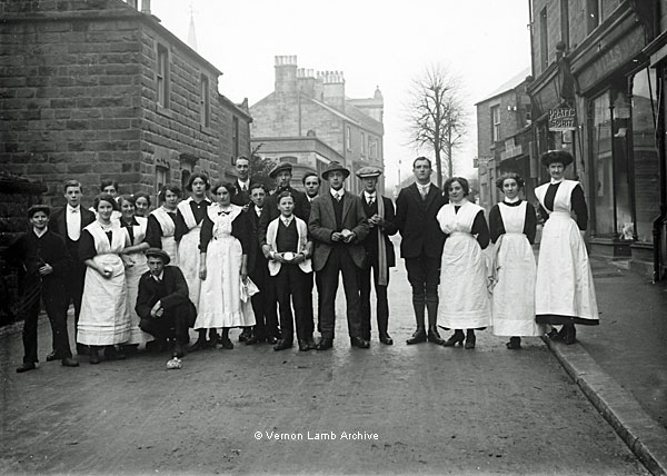 Group of hydro staff standing in road outside Mills boot and shoemakers.
