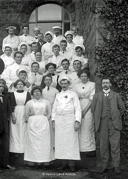 Kitchen staff. On steps. This group are also shown in