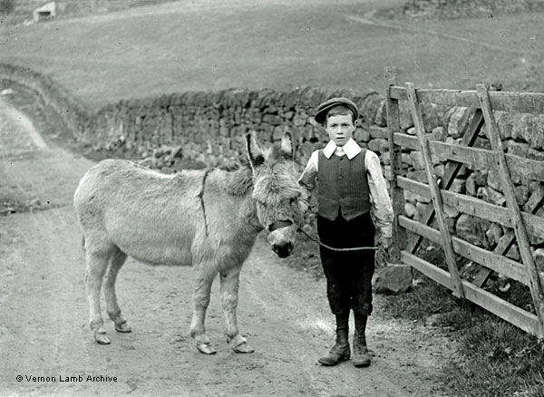 donkey's reins (rope). Dry stone wall behind them. Boy is smartly dressed,