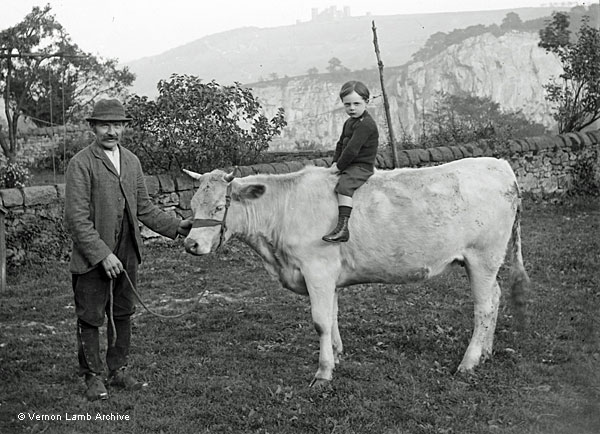 Man [Herbert Wardman?] holding cow, upon which is seated a small boy in button boots. Scene behind is High Tor and Riber Castle [also see