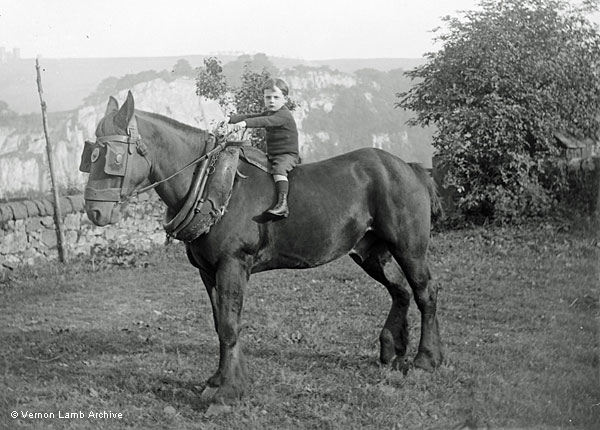 in button boots, this time seated on a cart horse which is wearing blinkers. Scene behind is High Tor and Riber Castle.