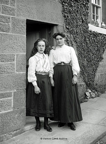 Two smartly dressed young women in a doorway. |