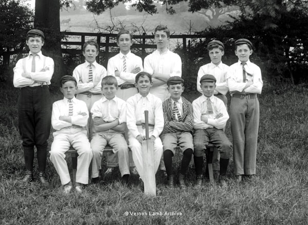 Young cricketers, at edge of field. Horse or pony and trap behind them on hillside [also see