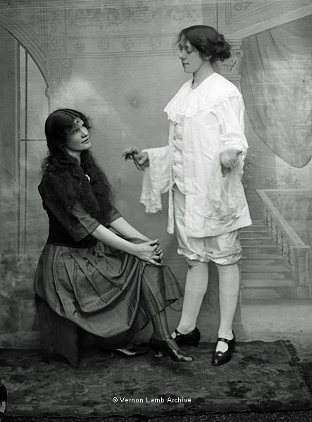 Two young women, one probably dressed as a boy,