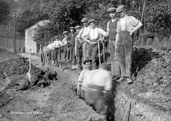 Long line of workmen digging a trench, laying something like pipes. Somewhere in Matlock and District.