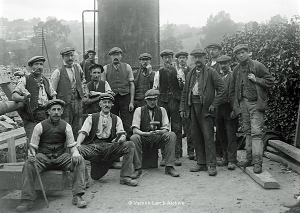 a pick. Behind them is a large metal boiler of some kind. It is probable